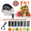 Multi-functional: 9 in 1 vegetable cutter with 7 replaceable blades you can cut cheese, tomatoes, onions, cucumber and cabbage in different shapes, sizes and thicknesses.